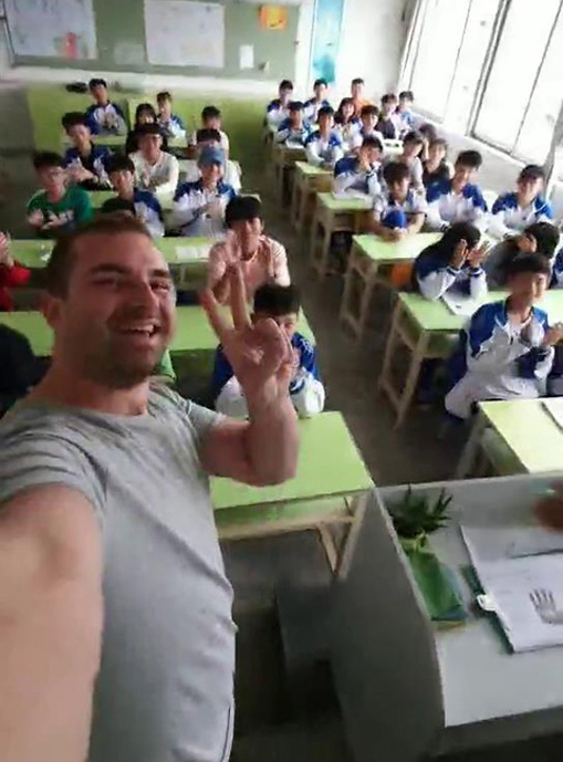 Marian先生用手机与同学们自拍合影