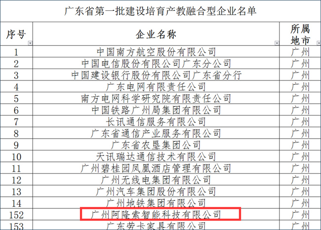 近日,我公司接到消息,我司(广州市阿隆索智能科技有限公司)正式入围广东省第一批建设培育产教融合型企业名单,本次公布的名单中,广州企业共有357家,其中中国南方航空、中国电信广东分公司、广东电网、中铁广州、广州无线电、广州日立、广州西门子以及广州唯品会等知名企业赫然在列,广州市阿隆索智能科技有限公司虽然公司实力比起这些巨擘来说有所不及,但是在产教融合领域阿隆索智能科技却是当仁不让的老牌企业了,因此这次入围广东省第一批产教融合型企业名单也算是实至名归。