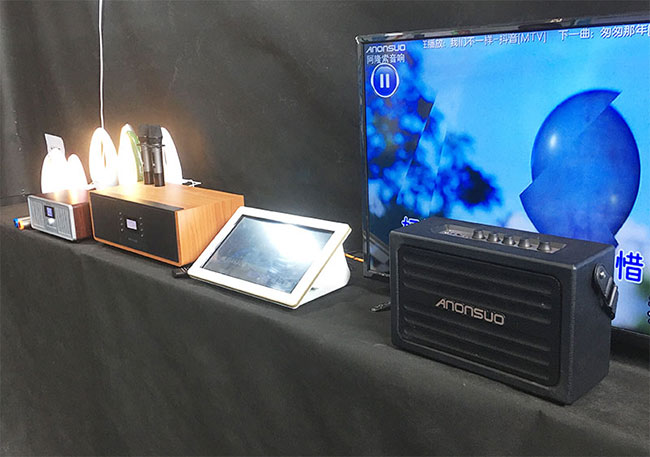 从现场的照片来看,阿隆索本次展示的产品中有一大部分是练歌唱歌听歌一体音箱以及K歌周边产品,其中H5/H6/H9/Partybox以及手提式新品,都是自带话题和遥控器,是标准的练歌唱歌听歌一体音箱,加上15.6寸大屏点歌机,这就占据了展位的大半壁江山,由此可见,阿隆索本次已经基本完成了产品方向的转型,将来将会在练歌唱歌听歌一体音箱的道路上下功夫。