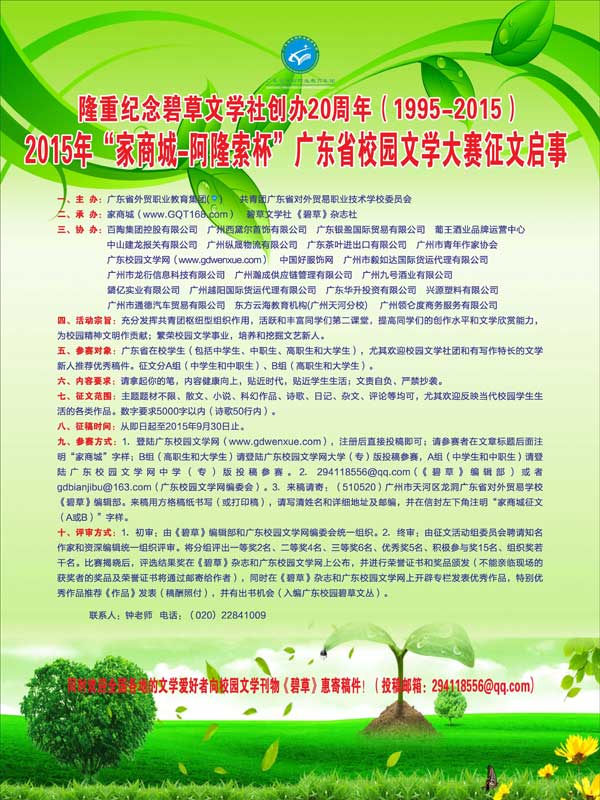 九、参赛方式:1.登陆广东校园文学网(www.gdwenxue.com),注册后直接投稿即可;请参赛者在文章标题后面注明“家商城”字样;B组(高职生和大学生)请登陆广东校园文学网大学(专)版投稿参赛,A组(中学生和中职生)请登陆广东校园文学网中学(专)版投稿参赛。2.294118556@qq.com(《碧草》编辑部)或者gdbianjibu@163.com(广东校园文学网编委会)。3.来稿请寄:(510520)广州市天河区龙洞广东省对外贸易学校《碧草》编辑部。来稿用方格稿纸书写(或打印稿),请写清姓名和详细地址及邮编,并在信封左下角注明“家商城征文(A或B)”字样。
